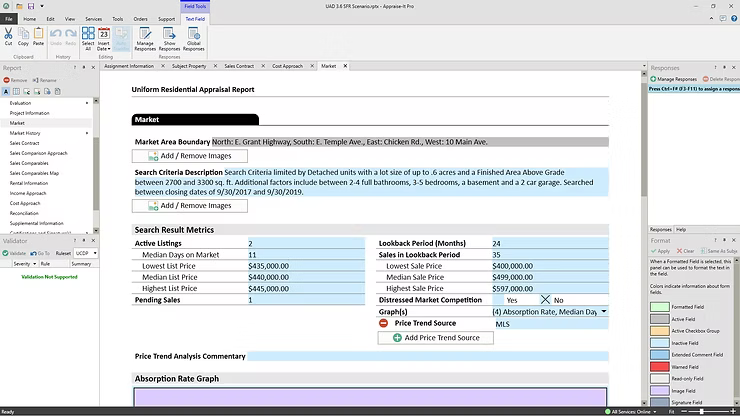 Most appraisal software suites present the current UAD forms in a What You See is What You Get (WYSIWYG) format. This means that you see the form roughly as it will be printed and delivered, like a piece of paper, and you “type” into each field.
